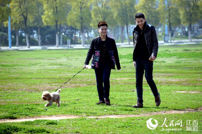 两位小伙伴牵着宠物狗在草地上散步